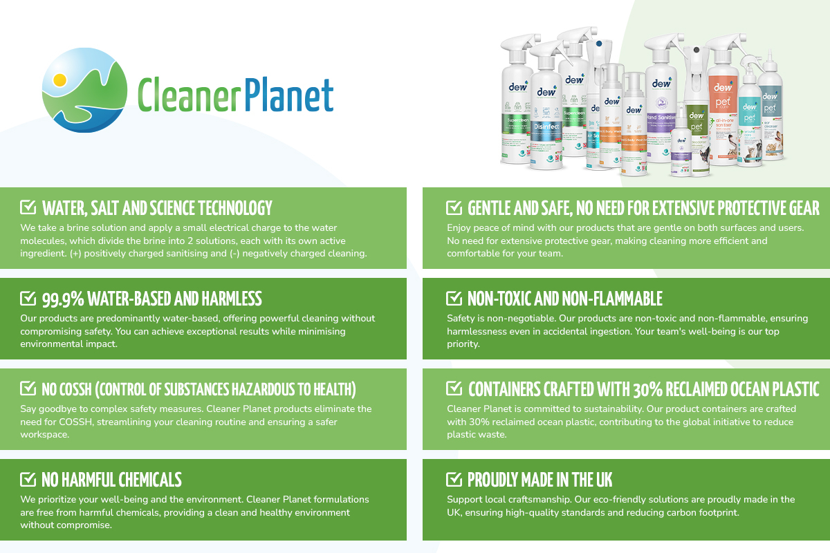 Reach out to us at hello@cleanerplanet.net or give us a call at 44 1227 809341 to delve into how Cleaner Planet's Dew sustainable cleaning solutions can enhance your business.