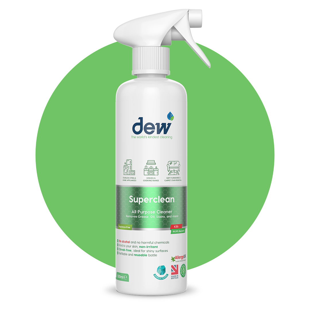 A much safer, more effective alternative to bleach, or other chemically based disinfectants, Dew Disinfect SuperHygiene is the wise choice for environmentally minded, informed families. It is 99.99% effective against viruses, bacteria and fungi and 80 times more effective than bleach